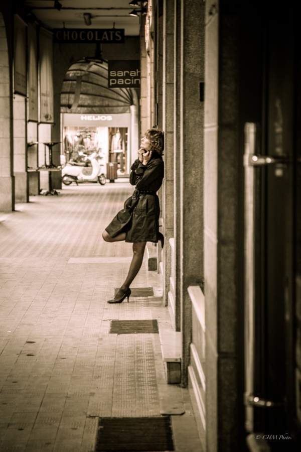 Une femme dans les rues d’Annecy un soir.